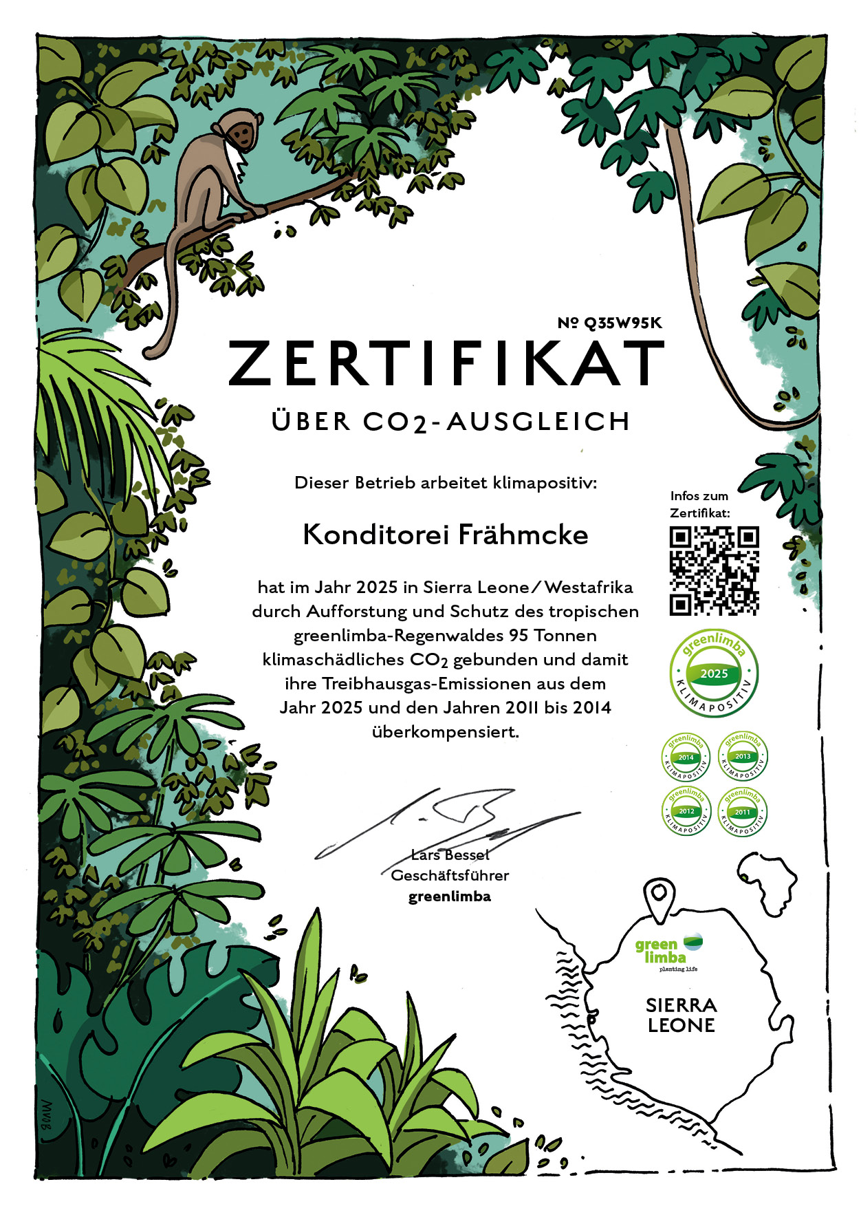 Im Jahr 2025 hat die Konditorei Frähmcke durch Aufforstung und Schutz des tropischen greenlimba-Regenwaldes 95 Tonnen CO2 gebunden und damit ihre Treibhausgas-Emissionen aus dem Jahre 2025 und den Jahren 2011 bis 2014 überkompensiert.