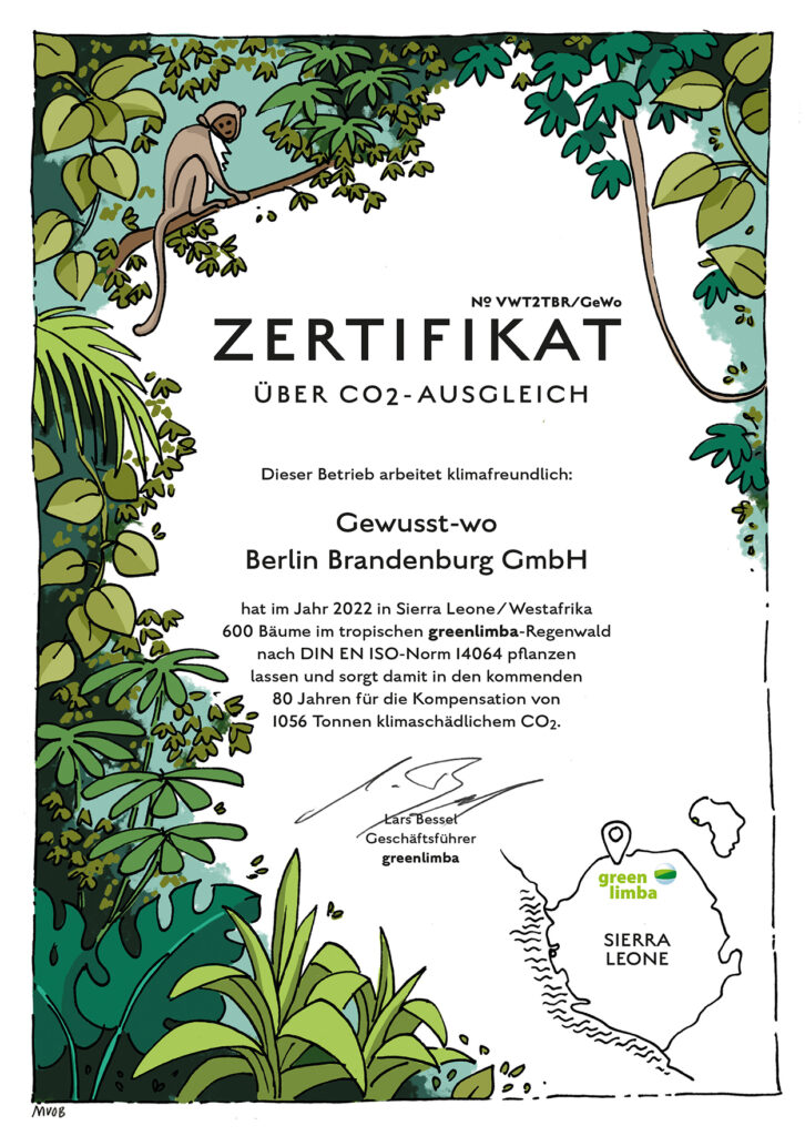 Im Jahr 2022 hat die Firma Gewusst-wo Berlin Brandenburg GmbH durch Anpflanzen von 600 Bäumen im greenlimba-Wald in Sierra Leone 1080 Tonnen CO2 kompensiert.